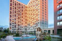 Современный дом- комфорт класса, встроенный в городскую инфраструктуру. двор с детскими и спортивными площадками.