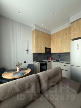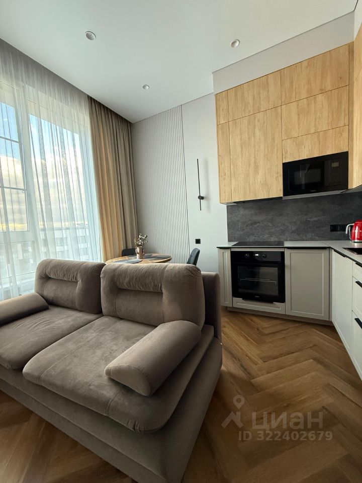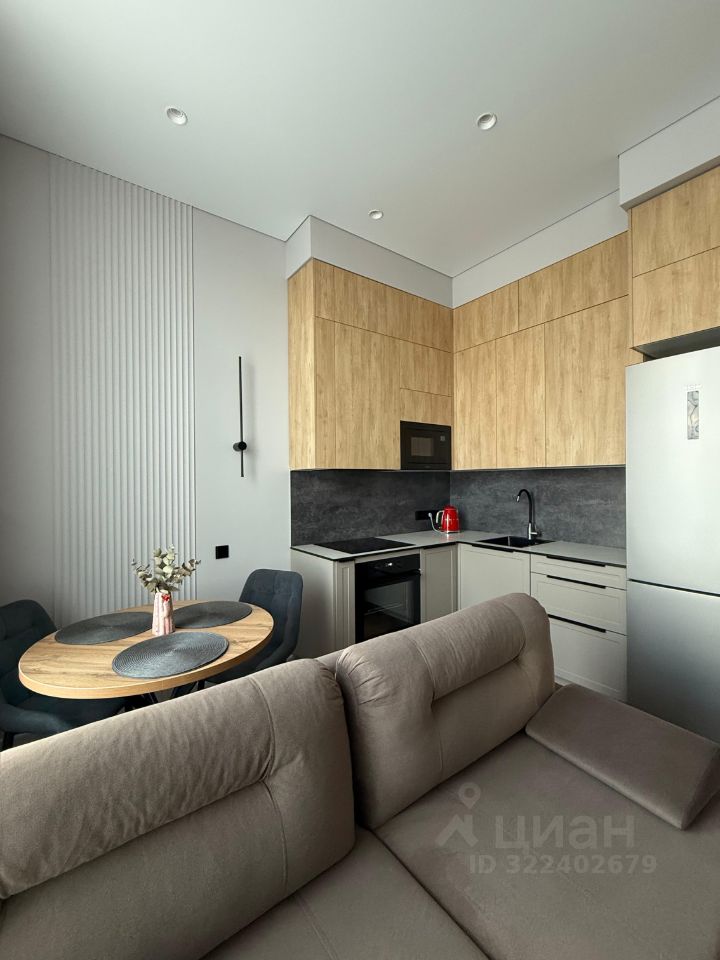 Кухня-гостиная оборудована современным кухонным гарнитуром со встроенной техникой, обеденный стол со стульями. В зоне гостиной комфортабельный диван, телевизор.