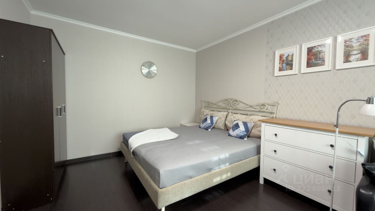В комнате широкая кровать 180x200, диван-книжка, шкаф для одежды, письменный стол, журнальный стол, комод, две прикроватные тумбочки, полка настенная.