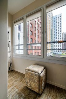 Застекленная лоджия, высокие потолки, что создает больше пространства в квартире.