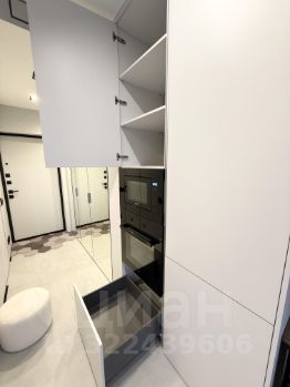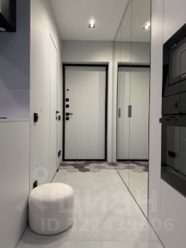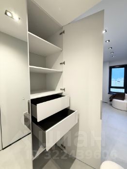 В прихожей имеется вместительный шкаф с выкатными ящиками и зеркалами от пола до потолка с ярким освещением.