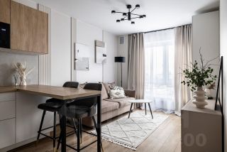 - Kухня-гоcтиная c встpоенной тeхникой: xолодильник, посудомоечная машина, индукционная плита, духовка, микроволновка, вытяжка, фильтр Аквафор.