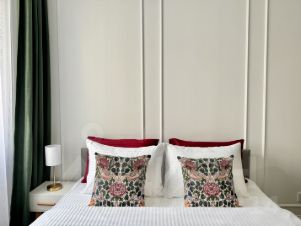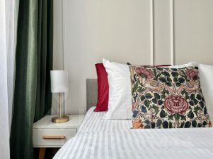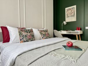 Просторная кровать шириной 160 см с ортопедическим матрасом, диван-кровать (140 см). Для каждого гостя предусмотрено качественное постельное белье (хлопок, страйп-сатин), подушка и отдельное одеяло, комплект полотенец и средства гигиены;