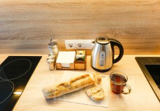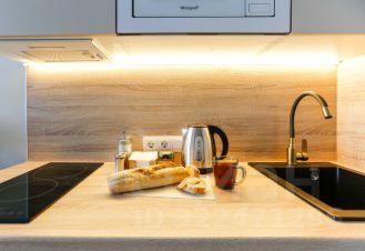 Кухня оснащена всем необходимым: варочная панель, микроволновка, чайник, посуда, столовые приборы и кухонные принадлежности.