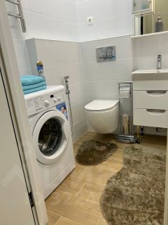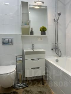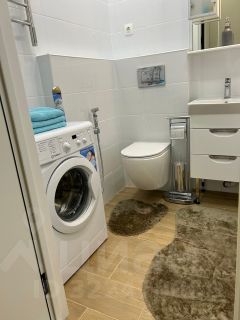Квартира оформлена в дизайнерском стиле, что придаёт ей современный и комфортный вид. Жилая площадь составляет 28 кв. м, а кухня — 9 кв. м, что позволяет разместить всё необходимое для вашего удобства. В квартире есть вся необходимая техника: кондиционер, холодильник, телевизор, посудомоечная и стиральная машины. Мебель присутствует как на кухне, так и в комнате. Санузел совмещённый, оснащён ванной.