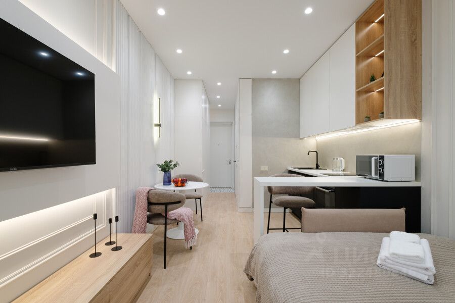 Стильный дизайн: Просторная студия с современным и стильным интерьером.