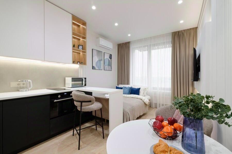 Удобства: Двуспальный диван, кухонная зона с электроплитой и духовкой, барная стойка.