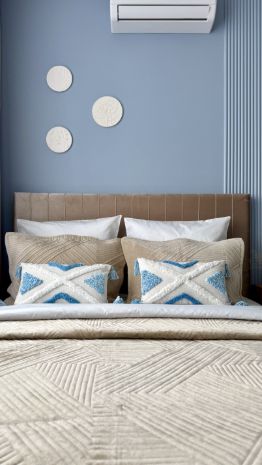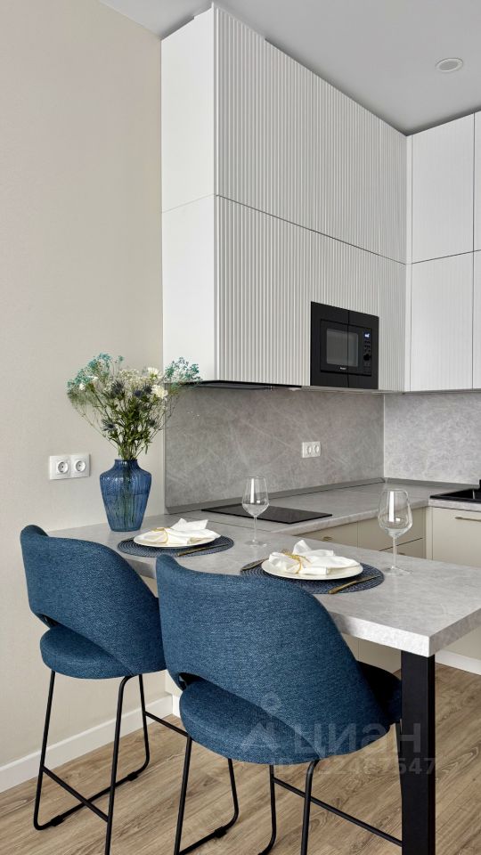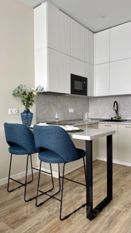 Квартира укомплектована новой качественной мебелью, а также всей необходимой техникой: ТВ, стиральная машина с функцией сушки, встроенный холодильник, варочная панель, вытяжка, встроенная СВЧ, посудомоечная машина, фильтр для воды, кондиционер.
