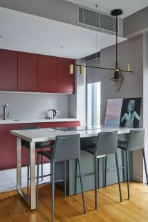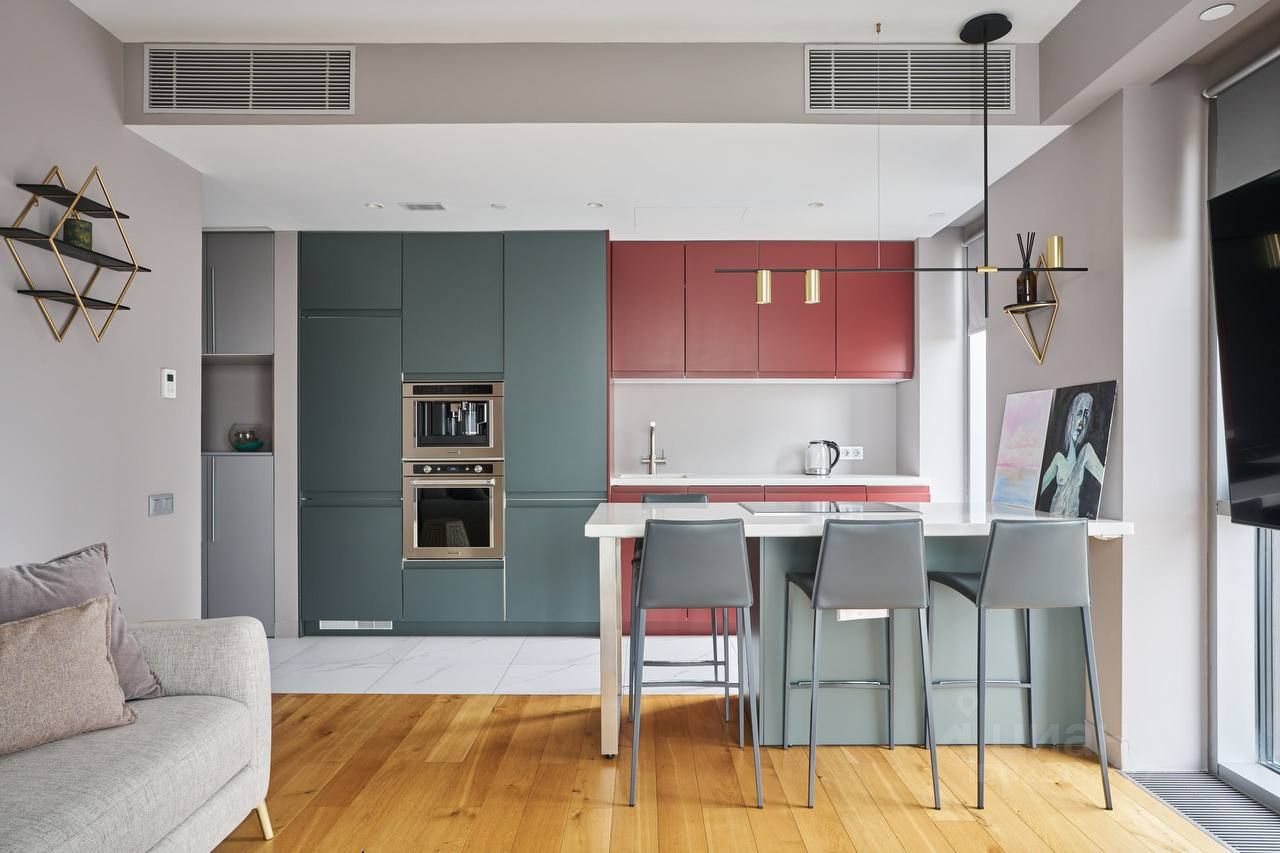 Кстати, кухня с гостиной — это одно пространство. С одной стороны это американская кухонная техника "KitchenAid": кофемашина, духовка, плита, посудомоечная машина, винный холодильник, продуктовый холодильник и морозильник. Рядом кухонный остров, на котором и расположена плита, а также места для обедов и ужинов.