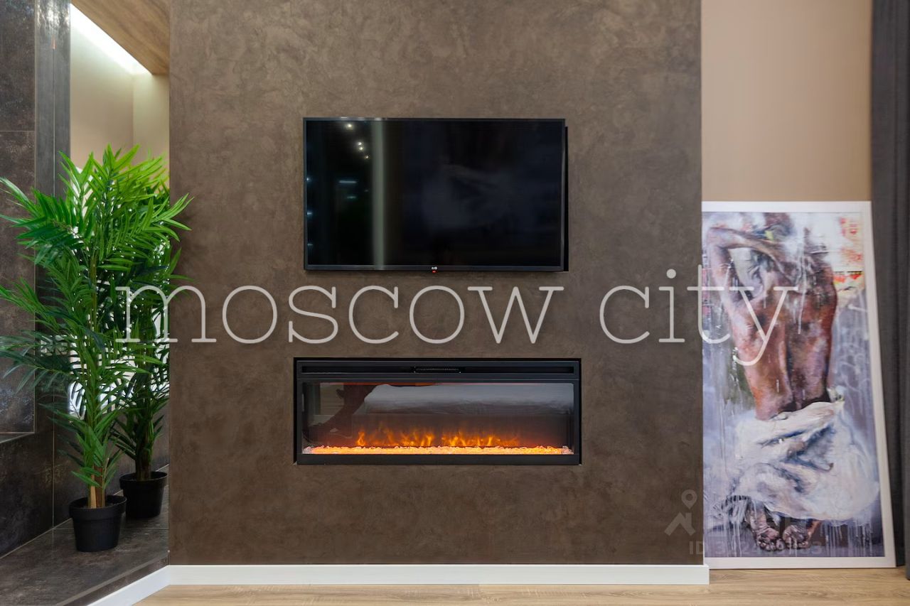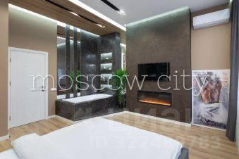 Мастер спальня с дизайнерским решением размещения ванной в спальне. Так же встроенный камин, что добавляет уюта в вечернее время.