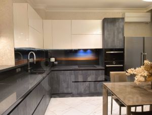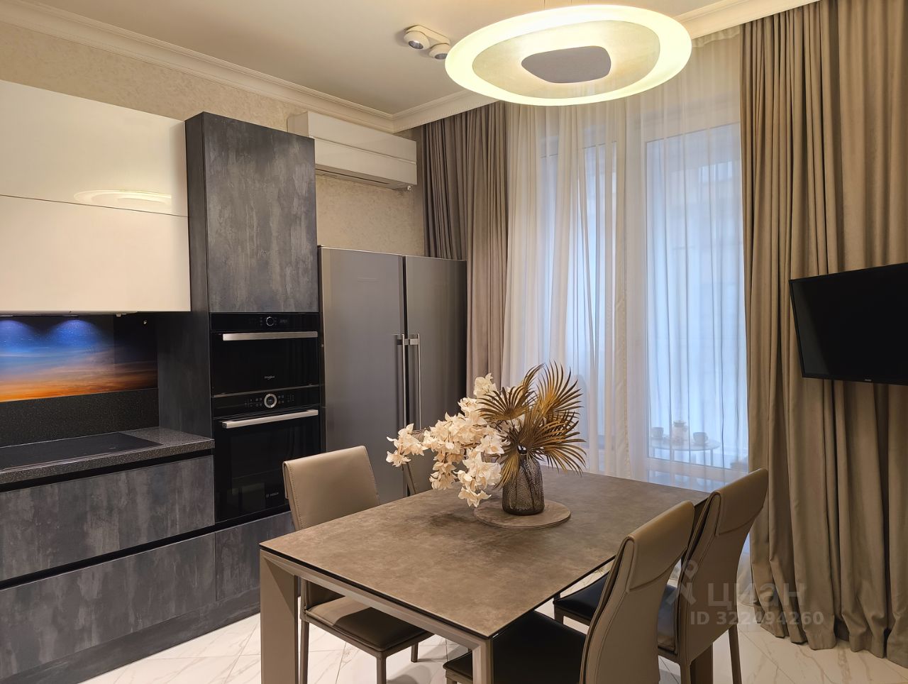 Кухонный гарнитур, техника: посудомоечная машина BOSCH, духовой шкаф, микроволновая печь, индукционная варочная панель AEG с функцией моста, вытяжка, измельчитель пищевых отходов (диспоузер), двухкамерный холодильник, телевизор Смарт ТВ. Есть необходимый минимум посуды. Кондиционер установлен.
