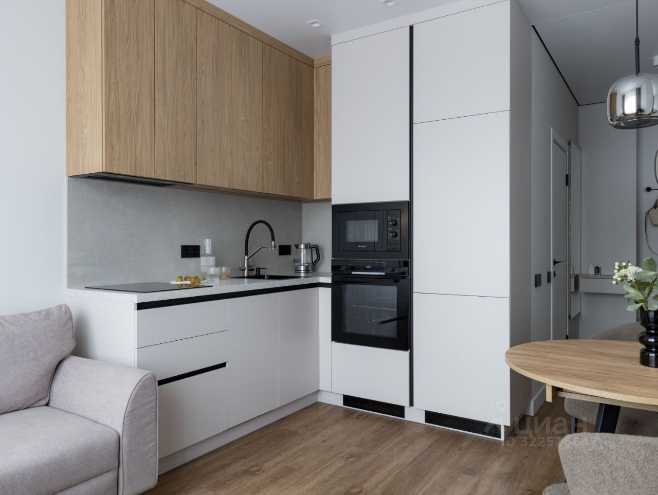 Есть вся необходимая техника: посудомоечная машина, духовой шкаф, микроволновая печь, индукционная панель, вытяжка, стиральная машина, кондиционер, телевизор, робот-пылесос и утюг, чайник.