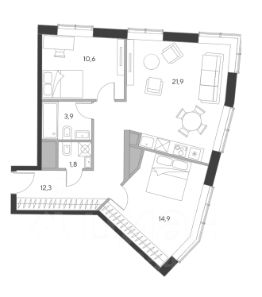 квартира 70 квадратов, 2 спальни и отдельная уютная кухня гостиная +2 санузла.