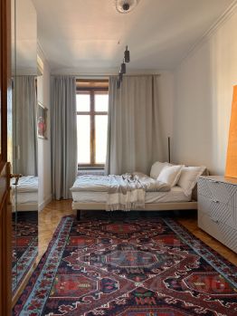 Квартира в самом центре Патриарших пудов . редкий дом , который находится во дворе , что делает квартиру очень тихой . Ни одно из окон не выходит ни на оживлению улицу , ни на дорогу . 3 изолированные комнаты , 2 из которых спальни . одна комната абсолютно пустая , может быть дополнительной спальней или кабинетом , плюс гостиная и кухня .