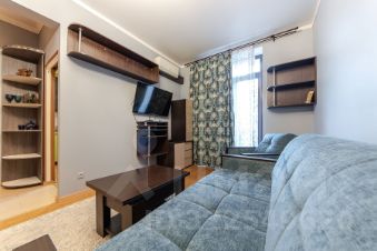 Комната 18 кв.м. с небольшим уютным балкончиком и панорамным окном в пол. Двойные деревянные стеклопакеты. На полу паркетная доска, стены под подкраску. Диван хорошего качества для двух человек (160*200), шкаф-купе зеркальный, кондиционер.