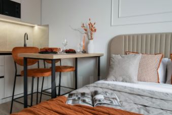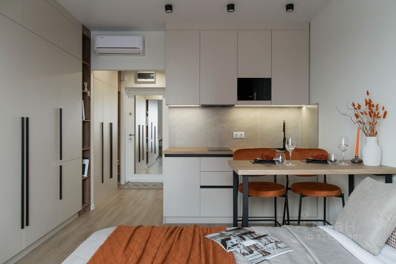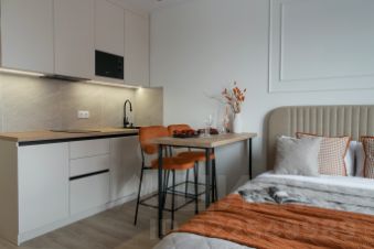 Квартира укомплектована всей необходимой мебелью и бытoвой тeхникой: стиральная-сушильная машинка, встроенный холодильник, посудомоечная машинка, микроволновая печь, индукционная плита, смарт-телевизор, кондиционер, встроенные шкафы, кровать с ортопедическим матрасом и подъемным механизмом.
