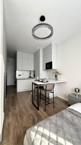 Квартира укомплектована новой качественной мебелью, сделанной по индивидуальному заказу, а также всей необходимой европейской техникой: стиральная машина с функцией сушки, посудомоечная машина, встроенный холодильник, микроволновая печь, варочная панель, вытяжка, кондиционер, фильтр для воды. В квартире уже есть новый набор посуды, столовые приборы и постельное белье.