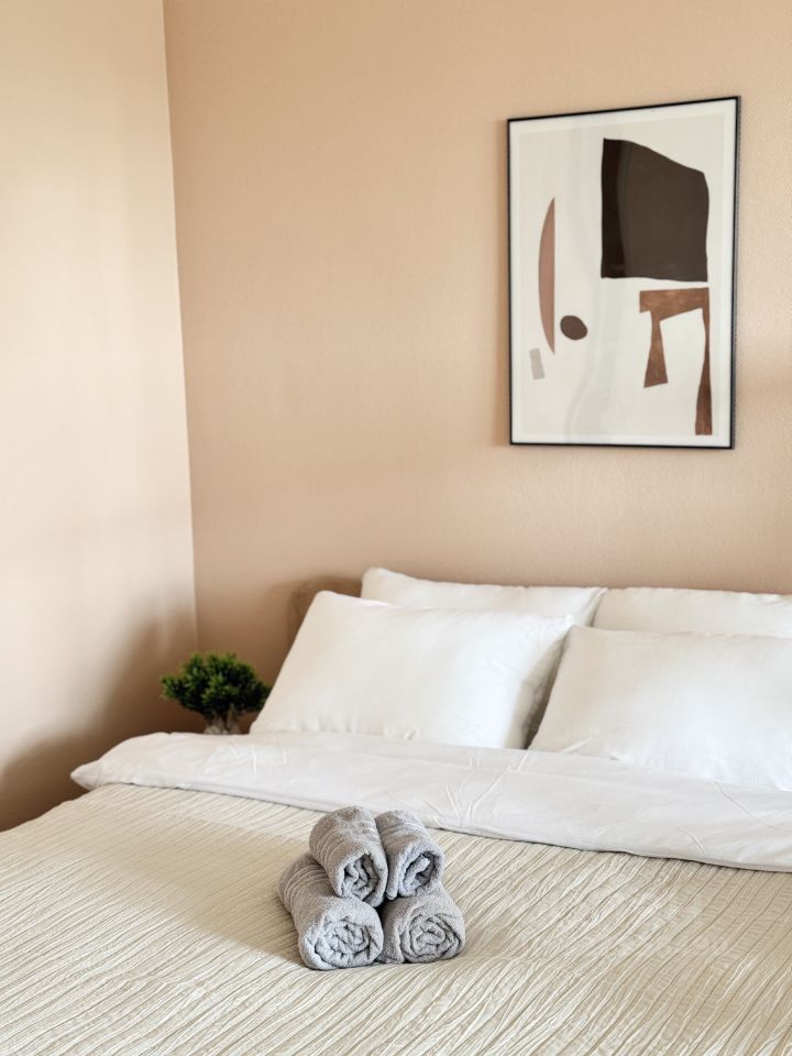 — Дизайн + комфорт: свежий интерьер в сканди-минимализме, ортопедическая кровать 160200, blackout-шторы & тихий кондиционер.