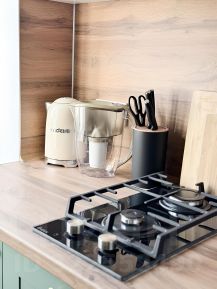 — Полноценная кухня: плита, микроволновка, холодильник, набор посуды, кофе, чай, конфеты и базовые специи уже ждут