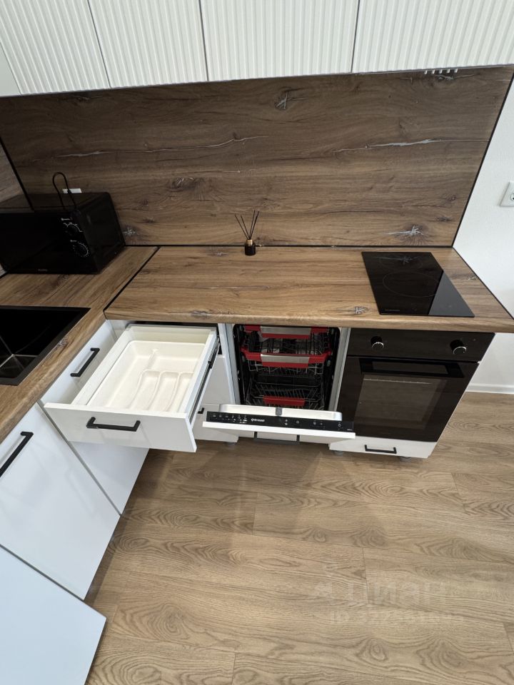 Вся мебель — новая, без следов эксплуатации: кухня с вместительными шкафами, шкафы в спальне и коридоре, дополнительные ниши и полки — мест для хранения действительно очень много.
