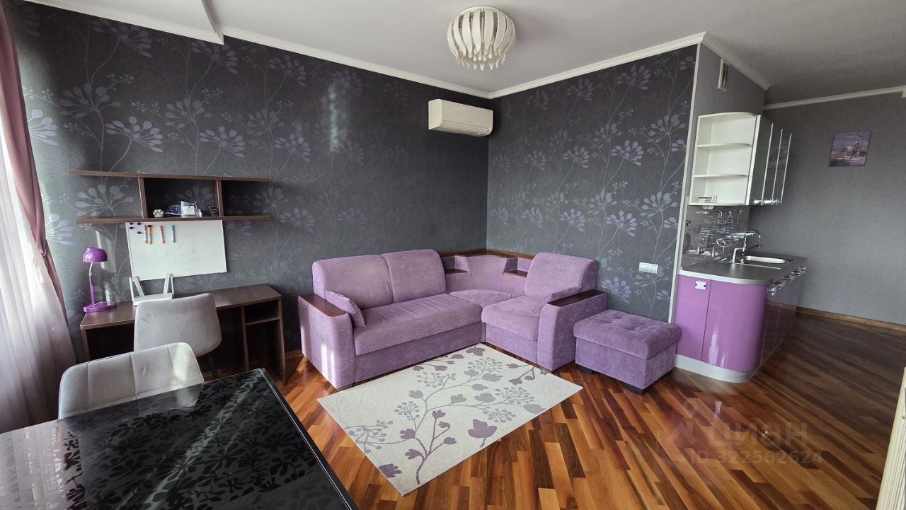 Квартира состоит из гостиной + кухня, спальни, и ванной комнаты. Гостиная, залитая естественным светом, обставлена мягкой мебелью.