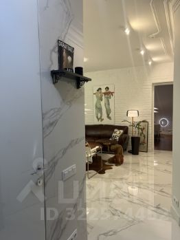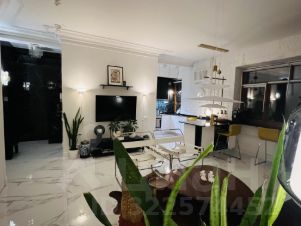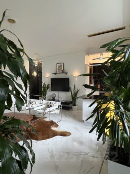Белоснежная гамма стен и пола( керамогранит) идеально сочетается с теплой натуральной кожей английского дивана и барных кожаных (натуральных) желтых стульев и контрастирует с черными встроенной кухней(со всей бытовой техникой, вкл. посудомоечную и кофемашину), совмещенным санузлом (с душевой, вся сантехника и смесители Burlington (Англия) и прихожей.