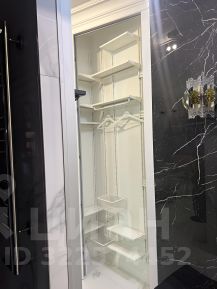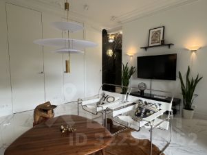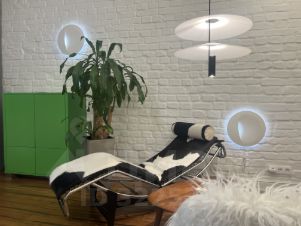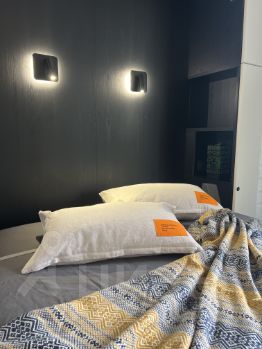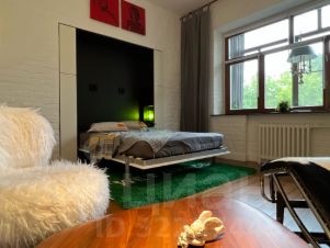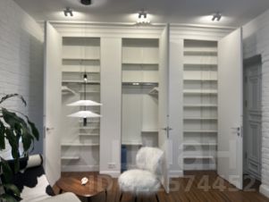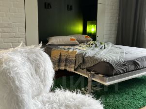 В спальне- откидная встроенная кровать с ортопедическим матрасом, с системой хранения, знаменитое кресло—шезлонг Ле Курбюазье (коровья шкура), огромная вместительная система хранения во всю стену-белые встроеные шкафы во всех жилых пространствах - обьективно больше гардеробной комнаты!