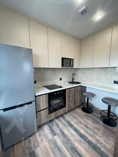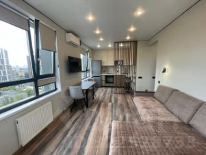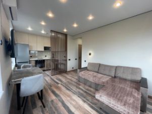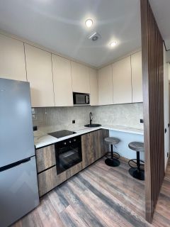 - кухня-гостиная (диван, кухонный гарнитур, телевизор, СВЧ, плита, холодильник, вытяжка, посудомойка, духовой шкаф, стол с мягкими стульями, кондиционер)