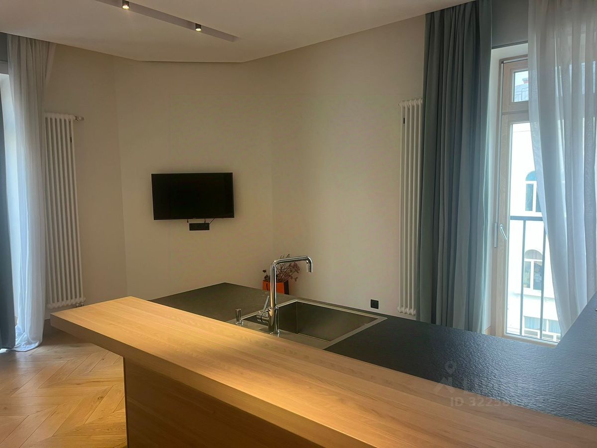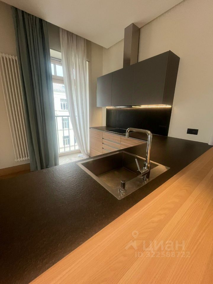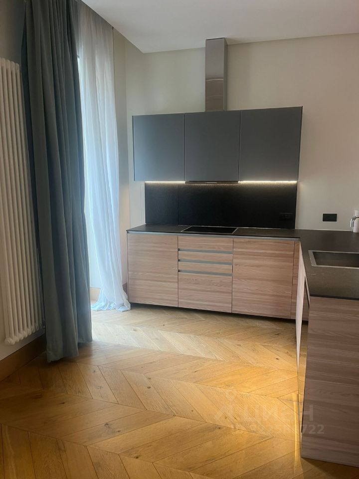 Функциональная планировка включает в себя кухню-гостиную, 2 спальни, гардеробную, 2 ванные комнаты. В каждой спальне есть окна в пол. В кухонный гарнитур встроен винный шкаф.