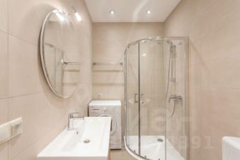 В квартире один совмещенный санузел с душевой кабиной, раковиной, зеркалом с подсветкой и стиральной машиной.