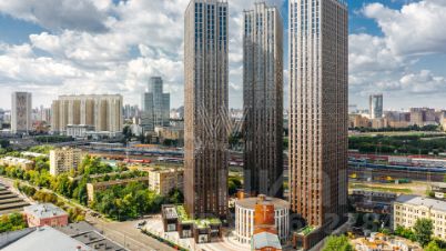 Главное о локации. "Пресня Сити" — три башни бизнес-класса по 44 этажа в неоклассическом стиле. Фасады облицованы клинкерной плиткой с градиентом от терракотового у основания до светло-кофейного на верхних уровнях. Лобби каждой башни отражает стихию: огонь с камином и красными акцентами, вода с глубокими синими тонами и земля с зелёными мотивами. Для жителей открыты фитнес-клуб, spa, супермаркет, кафе, детский сад и центр раннего развития. Дворы оформлены по проекту BuroMoscow: прогулочные аллеи, детские и спортивные площадки, лаунж-зоны в зелени.