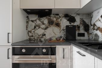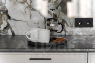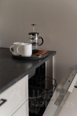 - большая кухня-гостиная (диван, гарнитур, СВЧ, плита, чайник, холодильник, вытяжка, посудомойка, духовка, стол с мягкими стульями, кондиционер)