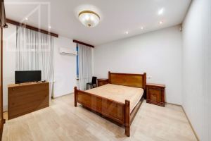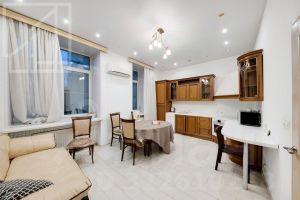 Планировка: кухня, три изолированные комнаты и один совмещенный с/у. Общая площадь: 115 кв.м. Ремонт выполнен в классическом стиле. Квартира с мебелью, вывоз невозможен. Окна выходят на обе стороны.