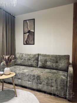 - гостиная, оборудованная премиальным комфортным диваном, сделанным на заказ (диван имеет полноценное спальное место), телевизором 43 Samsung, раскладывающимся столом с комплектом стульев и кондиционером;