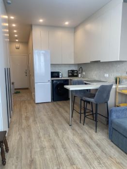 Квартира выполнена в современном стиле с качественным ремонтом. В комнате и на кухне есть вся необходимая мебель. Кухня оборудована всей необходимой техникой: холодильник, посудомоечная машина и современная плита. В жилой зоне установлен телевизор и кондиционер, что обеспечит комфортное проживание. В ванной комнате установлена душевая кабина. Также в квартире есть стиральная машина, поэтому можно не беспокоиться о стирке.