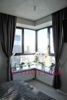 В квартире предусмотрена просторная планировка: большая кухня-гостиная и спальня с видом на город.