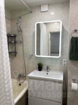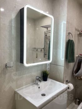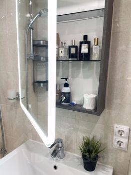 В ванной - современная сантехника, стиральная машина Bosch 6й серии, зеркало с LED-подсветкой и встроенной нишей для косметики, шкаф под раковиной, принудительная вытяжка и розетки рядом с ванной и раковиной.