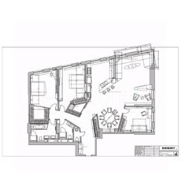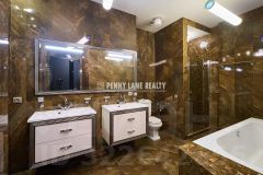 Функциональная планировка включает холл, кухню, совмещенную с гостиной и выделенной обеденной зоной, 2 спальни (со своими гардеробными), кабинет, 2 санузла, прачечную.