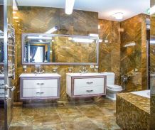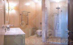В ванной комнате оборудована душевая кабина с дополнительным освещением, ванная, 2 раковины, унитаз, бойлер и большое зеркало со встроенной подсветкой.
