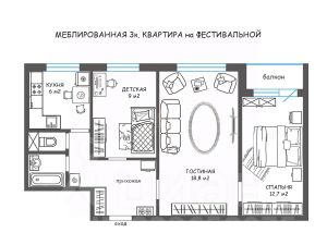 МЕБЛИРОВАННАЯ 3 к. КВАРТИРА на ФЕСТИВАЛЬНОЙ