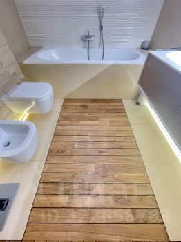 - Ванная отделана тиковым деревом и плиткой Cavalli;
