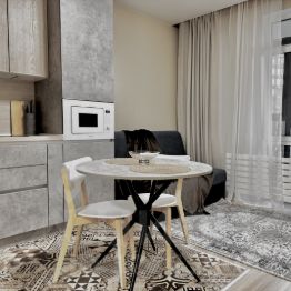 • Планировка: Светлая студия с совмещенной гостиной-кухней и просторной лоджией, где можно выпить утренний кофе или насладиться вечером.