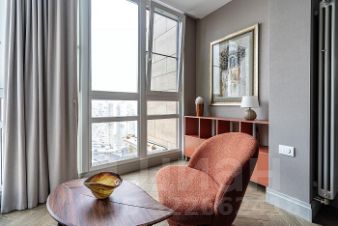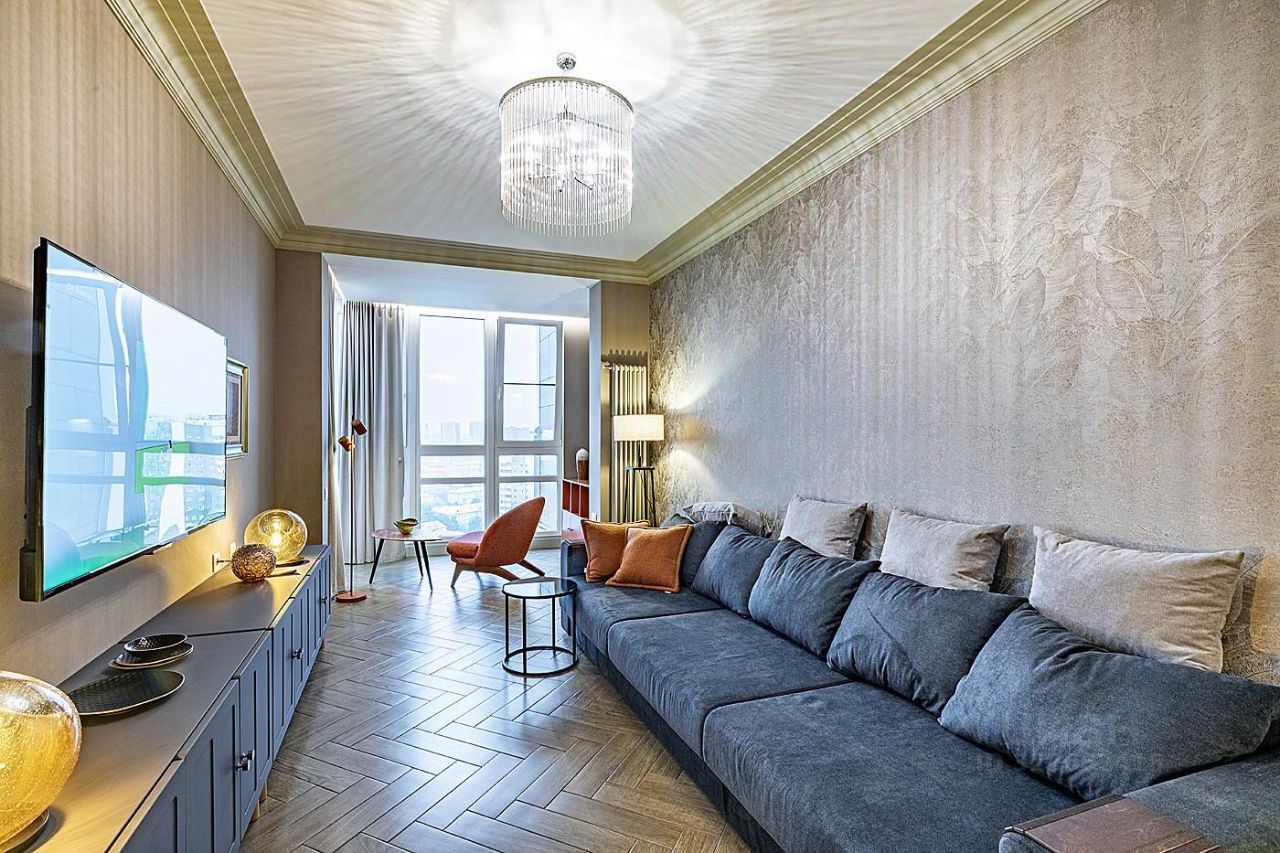 Простая гостиная: Мягкий удобный диван и приватная зона отдыха у панорамных окон, чтобы наслаждаться видами вечерней Москвы.