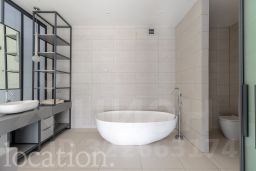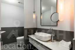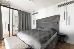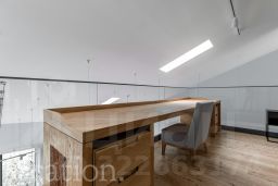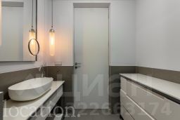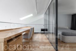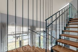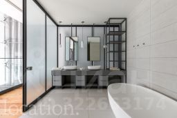 Роскошь и комфорт подчеркиваются дизайнерской отделкой в современном стиле, а также камином, создающим особую атмосферу. Все элементы интерьера, включая мебель и светильники, были изготовлены по индивидуальному заказу. Инженерия объекта отвечает высочайшим стандартам: здесь реализована профессиональная система увлажнения воздуха, общедомовая вентиляция дополнена локальной приточной системой во всех помещениях и фанкойлами для индивидуального климат-контроля в каждой зоне.