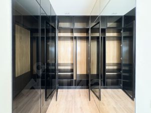 - спальня со шкафами кровать, прикованная тумбы, кресло, телевизор и ГАРДЕРОБНАЯ;