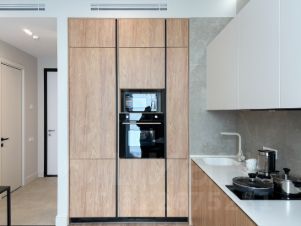 - кухонная зона: обеденный стол с двумя стульями, кухонный гарнитур со всей необходимой бытовой техникой и посудой.