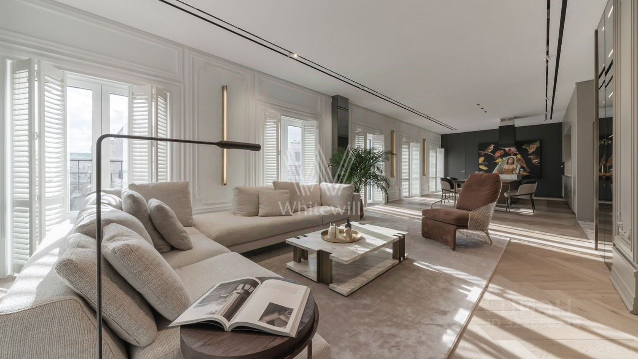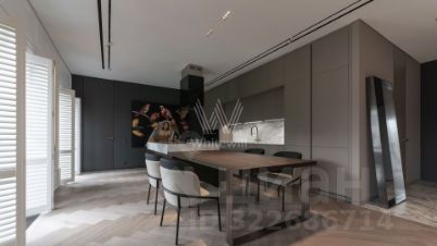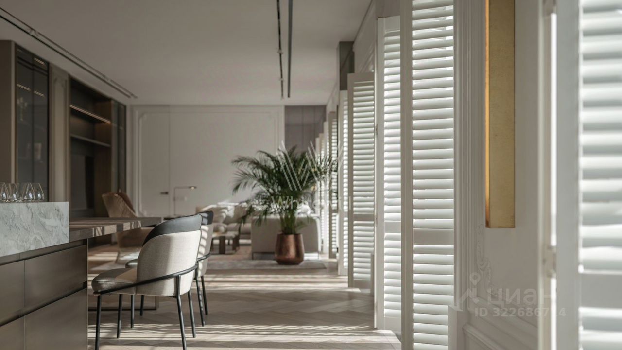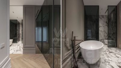 Стены украшены молдингами, картинами и эффектными светильниками, на окнах установлены стильные белые ставни-шаттерсы, а ковры на полу добавляют уюта и тепла. Кухня укомплектована гарнитуром Poliform и всей необходимой техникой, предусмотрены шкафы Rimadesio, смесители Gessi и дизайнерская кровать Baxter.