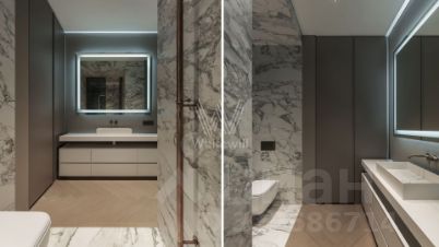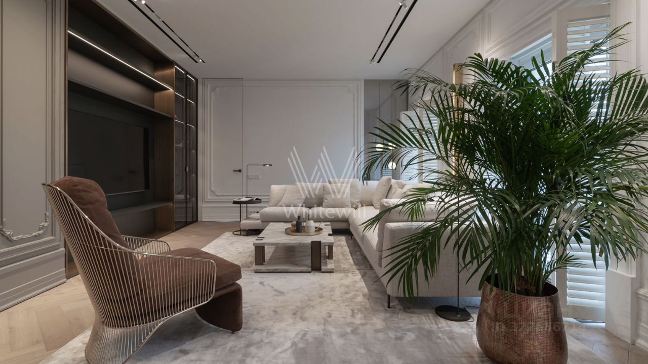 Планировка включает просторную гостиную с кухонной и обеденной зонами, лаунжем с мягким диваном и креслом, мастер-спальню с гардеробной и ванной комнатой, вторую спальню с санузлом, гардеробную комнату с постирочной зоной, холл и гостевой санузел. Дополнительно можно приобрести одно машино-место в подземном паркинге.