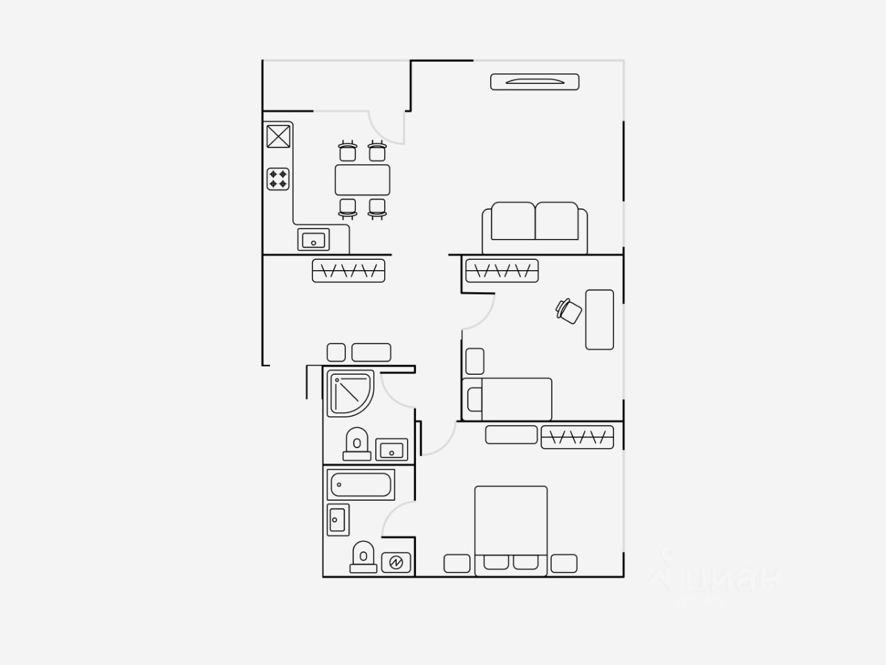 В квартире 2 санузла, первый - с ванной и стиральной машиной, второй - с душевой кабиной.