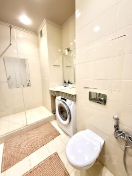 В квартире выполнен дизайнерский ремонт. В наличии вся необходимая бытовая техника: кондиционер, холодильник, посудомоечная и стиральная машины, телевизор, а также установлено оборудование по очистке воздуха .Просторная кухня площадью 15 кв. м позволяет комфортно готовить и принимать гостей. В квартире есть один совмещённый и один раздельный санузел, а также балкон. Виды на улицу и во двор. Установлена душевая кабина, что добавляет удобства в повседневной жизни.
